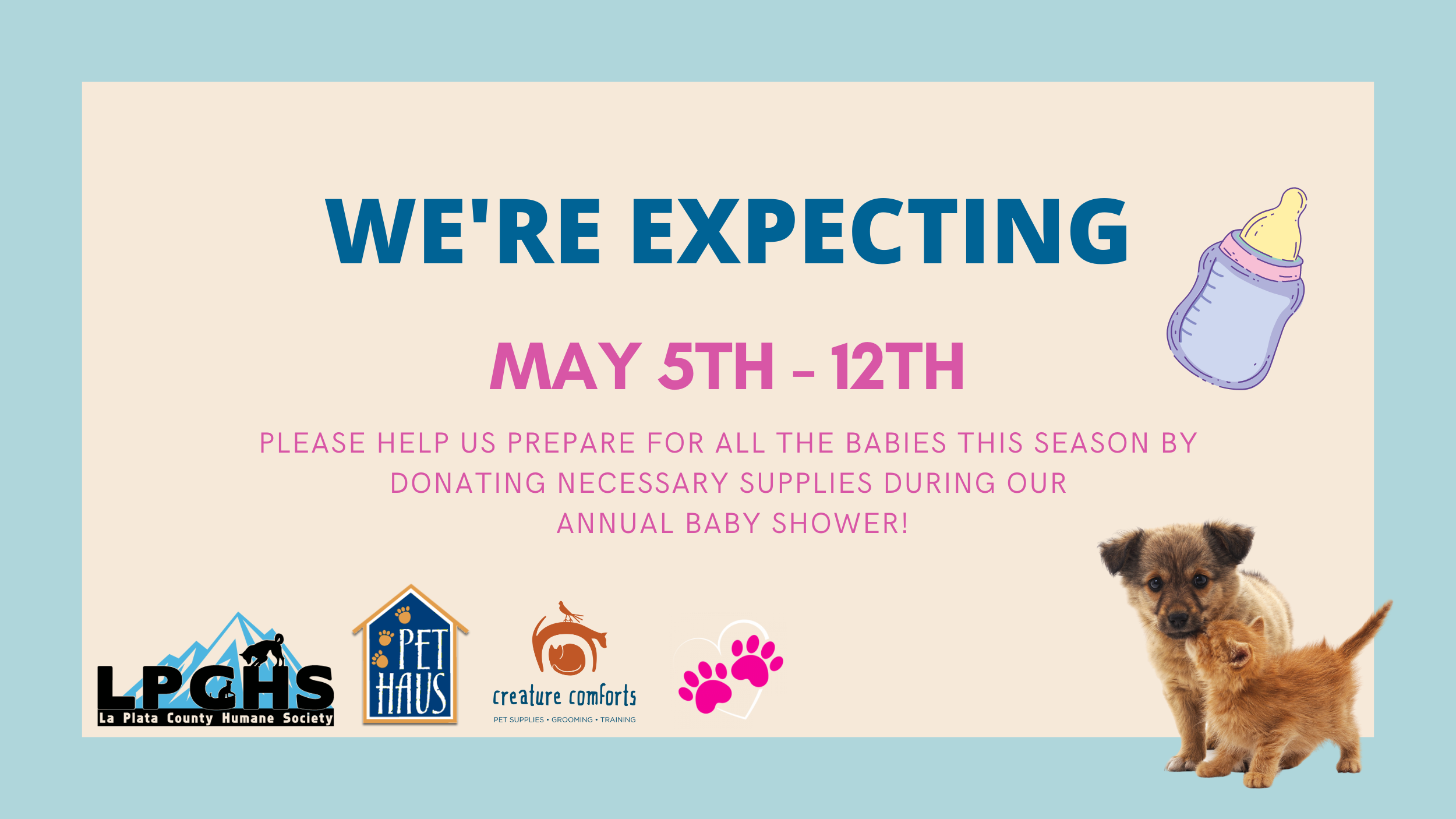 We're expecting! Help us prepare for all the babies this season by donating the necessary supplies during our annual baby shower! If you choose to sponsor a litter, you get to pick the theme the litter is named after! This could be anything from ice cream flavors, favorite book/movie characters, under the sea, candy, etc. If you are not sponsoring a litter, please put n/a in the comment sections. Thank you to our Platinum Sponsors Creature Comforts, Pet Haus, Durango Motor Company, and Dog Gone Gorgeous Pet Grooming for making this possible.